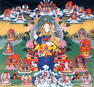 这张精美的唐卡供在我的房间里,让我时时想起往昔的大成就者,他们的功德和恩德。顶礼无垢光尊者、荣素班智达、晋美林巴尊者!三位祖师对大圆满法脉的传承弘扬作出的贡献、对后世修行者的恩德,若要述说,穷劫难尽。至诚祈祷传承上师们加持护佑众生离苦得乐!