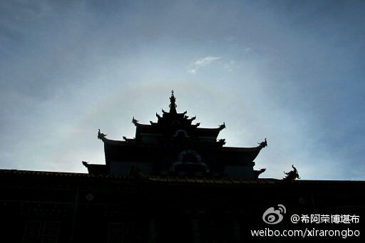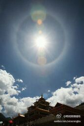 (1/2) 扎西持林莲师坛城上空美丽的光环。诸佛菩萨以各种显现度化众生,或许只是一束阳光,一阵清风,看似自然平常的景象,却能触发我们内心不平常的感受,使我们心生温柔和谦卑,懂得虔敬感激,并且最为重要的是,它让我们一念清净想到为众生的离苦得乐而发愿精进修行,圆满觉悟。我们曾经无数