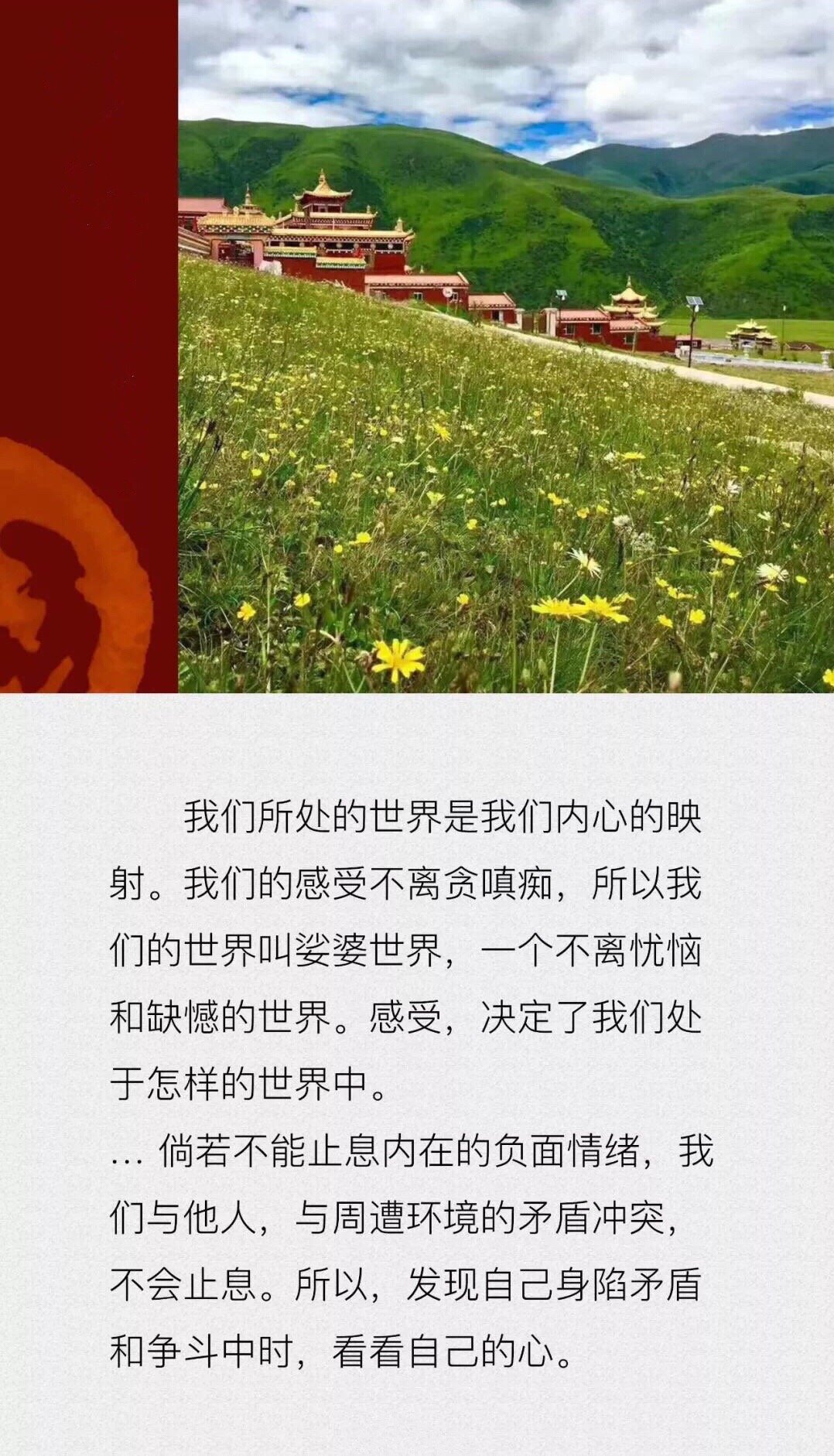 有时候避免负能量干扰的有效方法,恰恰是慈悲心,因为它的开阔柔韧会让我们跳出眼前的一时一事,看到事件更大的背景,看到在这个背景里众多因素的相互制约和相互促成。