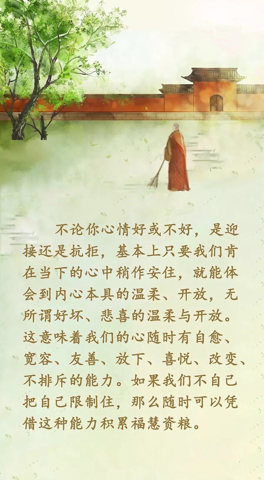 不论你心情好或不好,是迎接还是抗拒,基本上只要我们肯在当下的心中稍作安住,就能体会到内心本具的温柔、开放,无所谓好坏、悲喜的温柔与开放。这意味着我们的心随时有自愈、宽容、友善、放下、喜悦、改变、不排斥的能力。如果我们不自己把自己限制住,那么随时可以凭借这种能力积累福慧资粮。