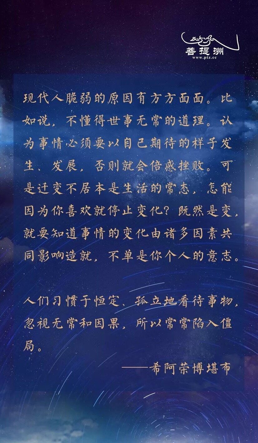 人们逃避无常是因为他们不清楚自己所处的真实状况。首先他们认为无常只是人生的一种际遇,像逆境,只要找到最佳解决方案,就可以规避。他们很努力地尝试不同的方法,希望得到一个一劳永逸的答案,然后才能安心生活。可是,他们极力排斥的恰是生活本身,除了变化,生活中还有什么呢?只要稍加留意就不难发现生命中的一切都是无常的。四季更迭,人事代谢。我们的身体、情绪、思想,无一不在变化之中。无常不是人生的一段过渡期,而是整个人生,不管你愿不愿意,都必须与它终生相处。