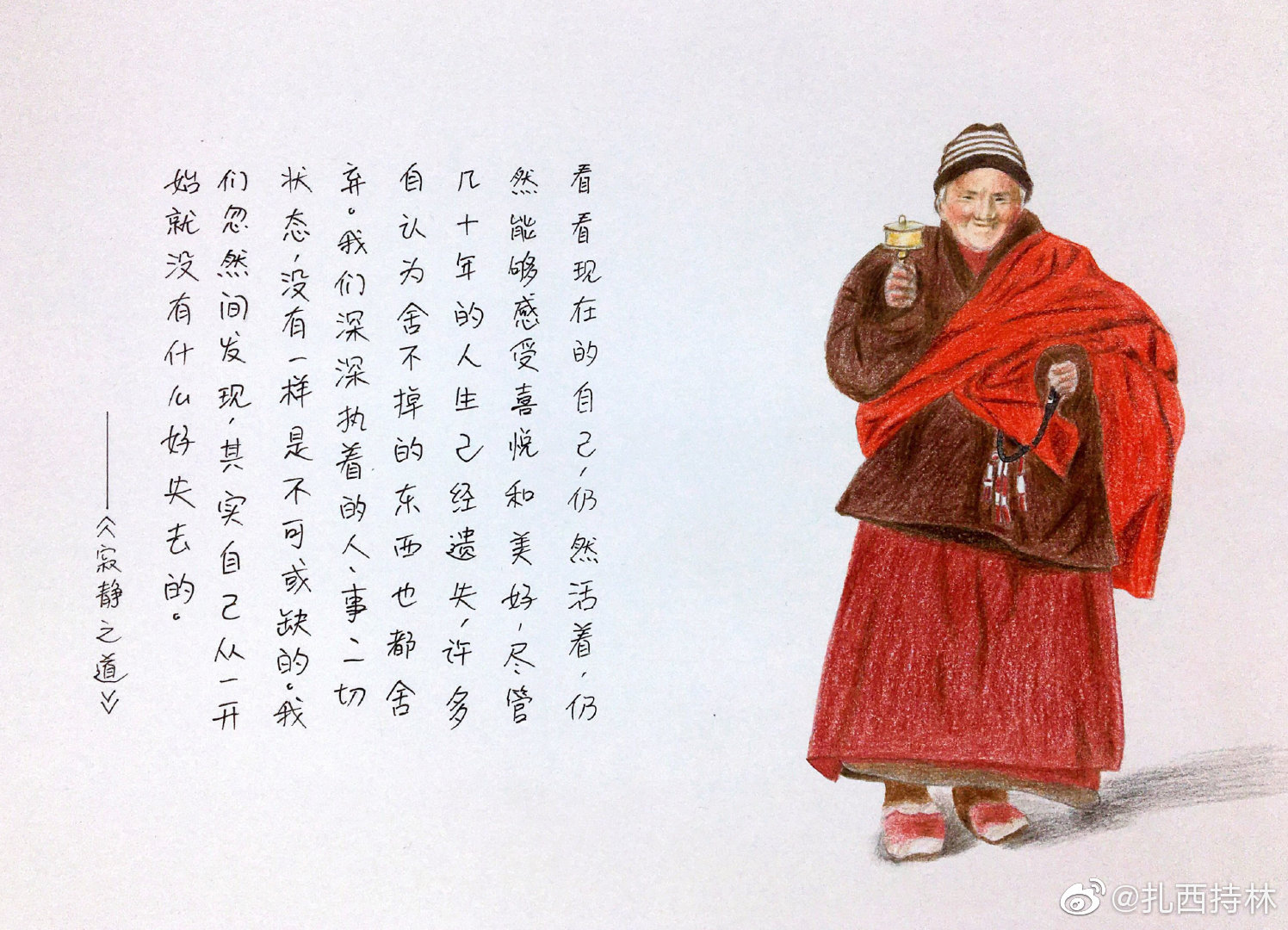修行不是做样子,要真的发生内在的转化,而内在转化有多难!一个很小的改变也是无数遍觉察、反省、自问、调整才得以实现。说实话,没人逼着我们修行,我们也不用有“必须给谁一个交代”的想法,如果我们不想改变,随时可以放弃修行,为何既不放弃又不真正去改变呢?如果我们想假装一副“优秀佛教徒”的样子,当然也尽可以一直装下去,没人会揭露你,但最终(也许是死亡来临那一刻,也许更早)我们还是得诚实地面对自己,逃不过去的。