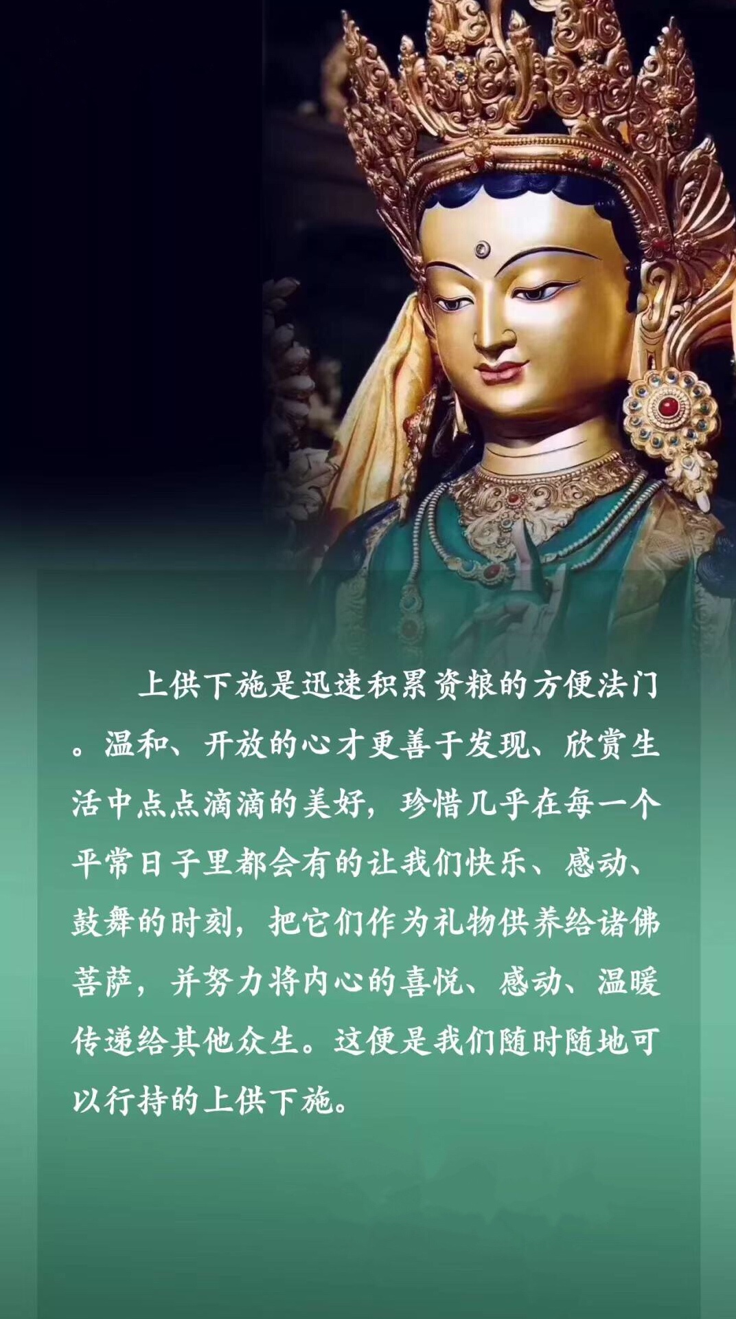 上供下施是迅速积累资粮的方便法门。温和、开放的心才更善于发现、欣赏生活中点点滴滴的美好,珍惜几乎在每一个平常日子里都会有的让我们快乐、感动、鼓舞的时刻,把它们作为礼物供养给诸佛菩萨,并努力将内心的喜悦、感动、温暖传递给其他众生。这便是我们随时随地可以行持的上供下施网页链接