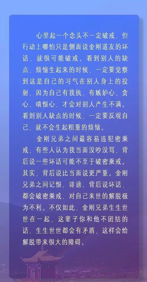 世间上的分别念永远也不会自然间断,不要说在白天,即使晚上梦境中的分别念也连绵不断,我们每日就是这样在浑浑噩噩中度过。从无始以来到现在,就是以如此分别念使无数的有情在轮回中不断地流转,什么时候当我们使自己的心安住下来,在本性中休息,彼时所有的分别念就没有了。——法王如意宝晋美彭措