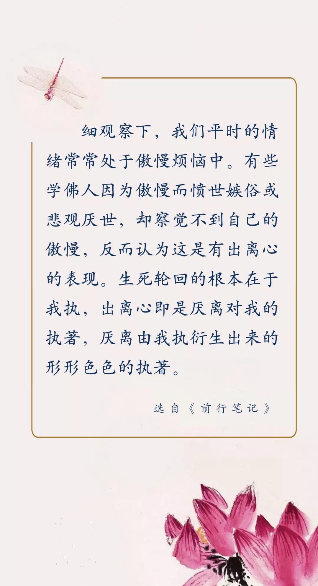 当嗔恨贪执等具伤害性的情绪生起时,立刻觉察到它并试着去放松那股情绪。再次生起,再觉察再远离。轮回并不抽象,没有这一次次的觉察和出离,所谓解脱轮回便易流于空谈。