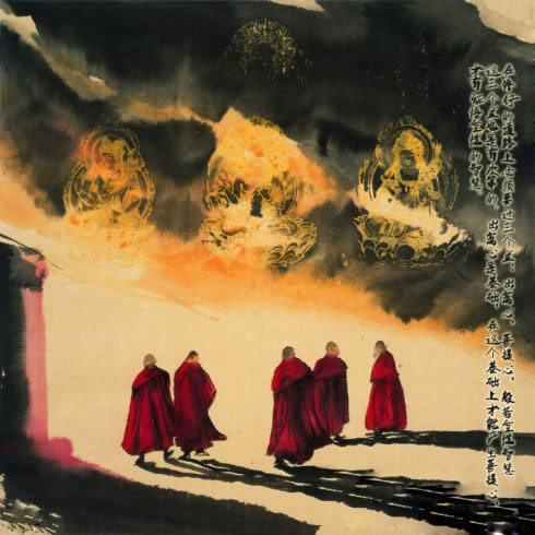 皈依也是同样。我们感觉到轮回非常可怕,如何从轮回里逃脱呢?只有皈依三宝,才能有希望。其他世间的任何方法,都不可能让我们得到解脱。即使其他宗教有一些神通、神变,但是它们有一个共同的缺憾,就是不承认无我。在从两三千年之前的外道经典,到现在这些外道的经典当中,始终找不到宣讲大空性的书籍。在这些观点的基础之上,无论修行也好、行善也好,由于没有证悟空性的智慧,就只能被束缚在轮回当中。即使我们修学外道,也没有办法真正从轮回中跳出来。只有佛法才能让我们安全地到达彼岸,趋向涅槃。所以,如果我们对轮回感到怖畏,就只有皈依三宝。