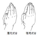 顶礼时首先要合掌,这也有一些讲究。两只手掌不能完全地合在一起,从手心到手指之间都要有空隙。合掌的方式有两种:一是嘎屋式。嘎屋是一种带在身上的四方形法器,由于手指头没有合在一起,看起来有些像方形。二是莲花苞式。两个食指与无名指放得比中指低一点,指尖接触,这样看起来有些像含苞待放的莲花。(请看图)