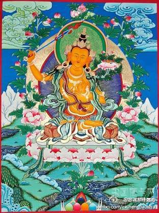 文殊菩萨,是诸佛菩萨智慧的象征。他右手持一把剑,但这把剑不是针对任何众生,而是针对众生心里的痴毒。因为愚昧会产生无边的痛苦,因为愚昧会毁掉自他的幸福。