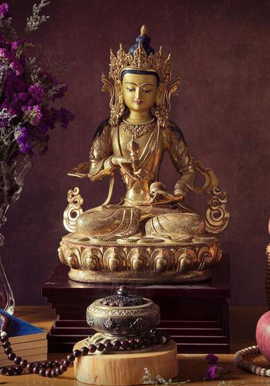 我们都要供养地藏菩萨的尊相,常常以香花、净水、饭食、水果、妙衣、灯明等,敬献在地藏菩萨尊前。无论有什么所求,都像孩子祈求慈母那样,在地藏菩萨像前顶礼、归依、称名、至心祈求。这样也符合《地藏本愿经》里世尊的教导,必然实现无边利益。我们应当在坚固地信仰、一心依止的前提下,念诵地藏菩萨圣号等,作各种与菩萨相应的法行,并将其贯彻到一生之中。