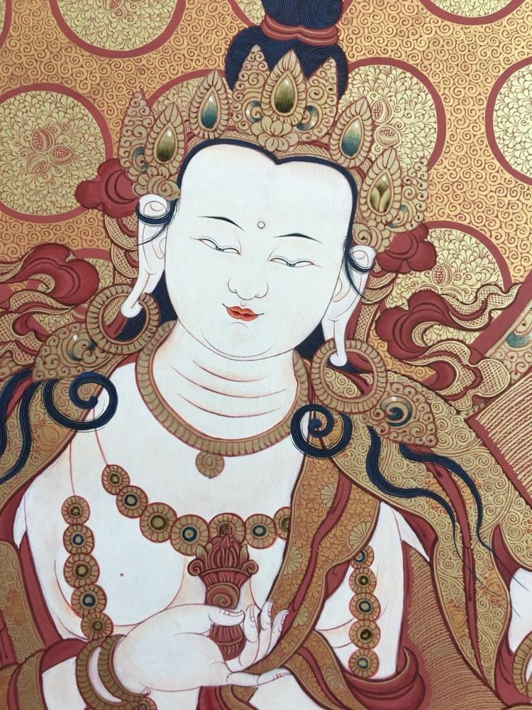 再者,持诵此咒,在整个自然界、人文世界上会发生怎样的增长呢?持咒相应后,大地的精气、滋味得到增长,众生的精气、精力得到增长。学法方面,精气、善心得到增长,智慧光明得到增长。菩萨道行上,六种波罗蜜多妙行都得到增长。如果想得五眼,那肉眼、天眼、慧眼、法眼、佛眼都能得到增长。又会增长灌顶,增长生天和涅槃。像这样普能增长一切善法。又能增长一切大地种子的根茎枝叶花果,增长药谷的精气滋味,增长雨水,增长有利益的地水火风,增长内心的喜乐,增长财宝,增长殊胜的力量,增长一切受用资具。而且,这个陀罗尼能让一切智慧达到猛利,破除烦恼贼。它真是大如意宝,想要增长功德的话,就要多持长咒。