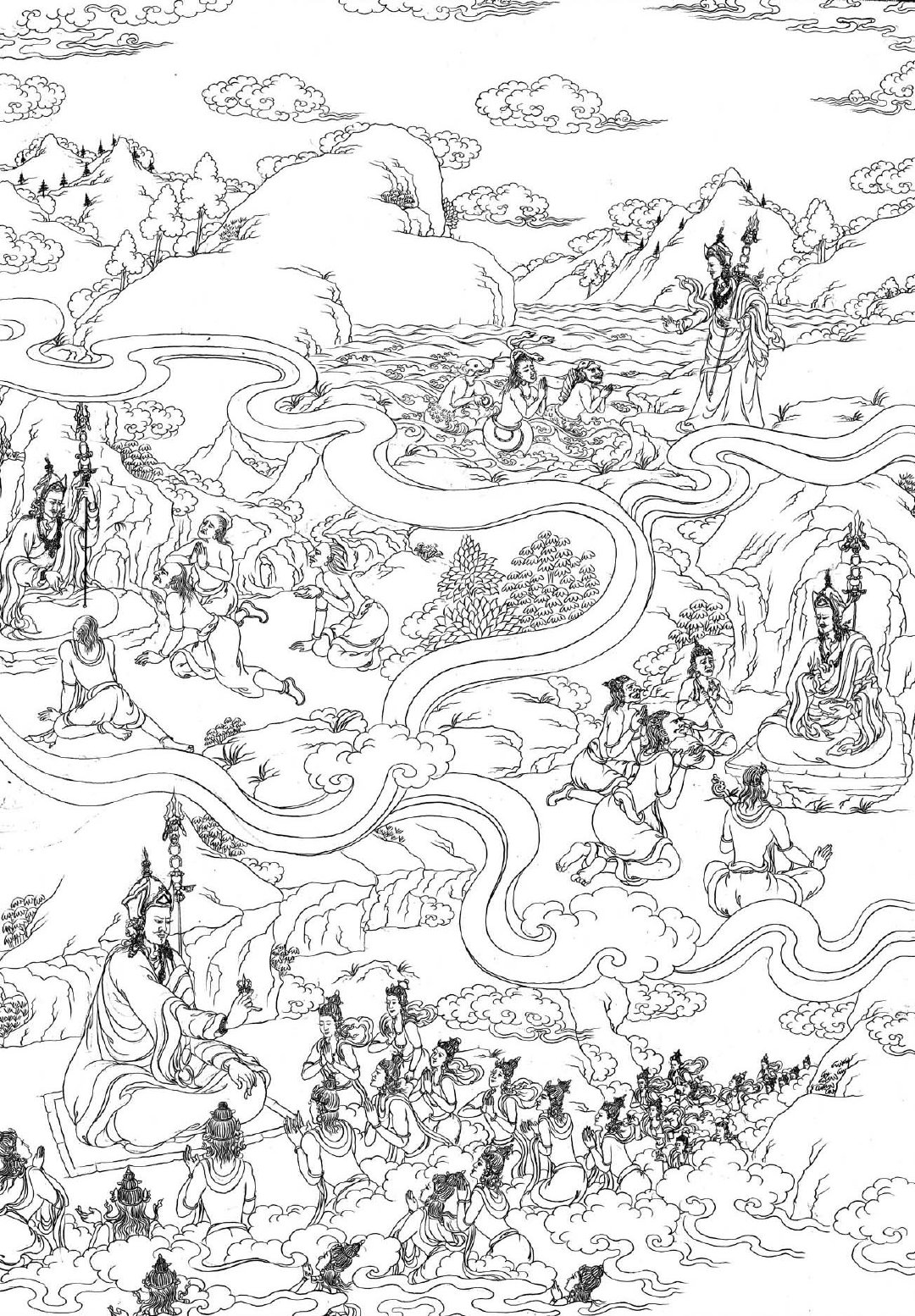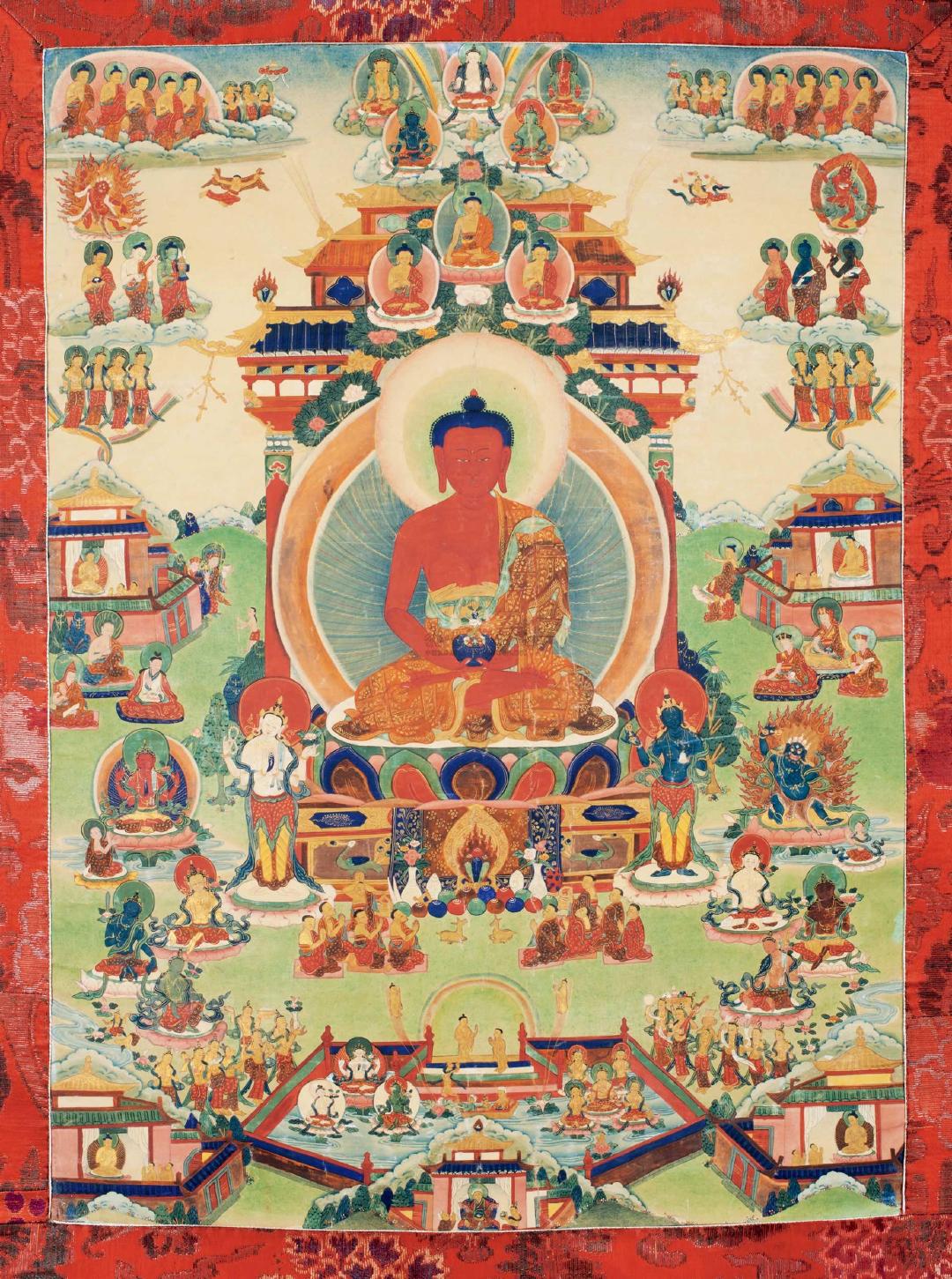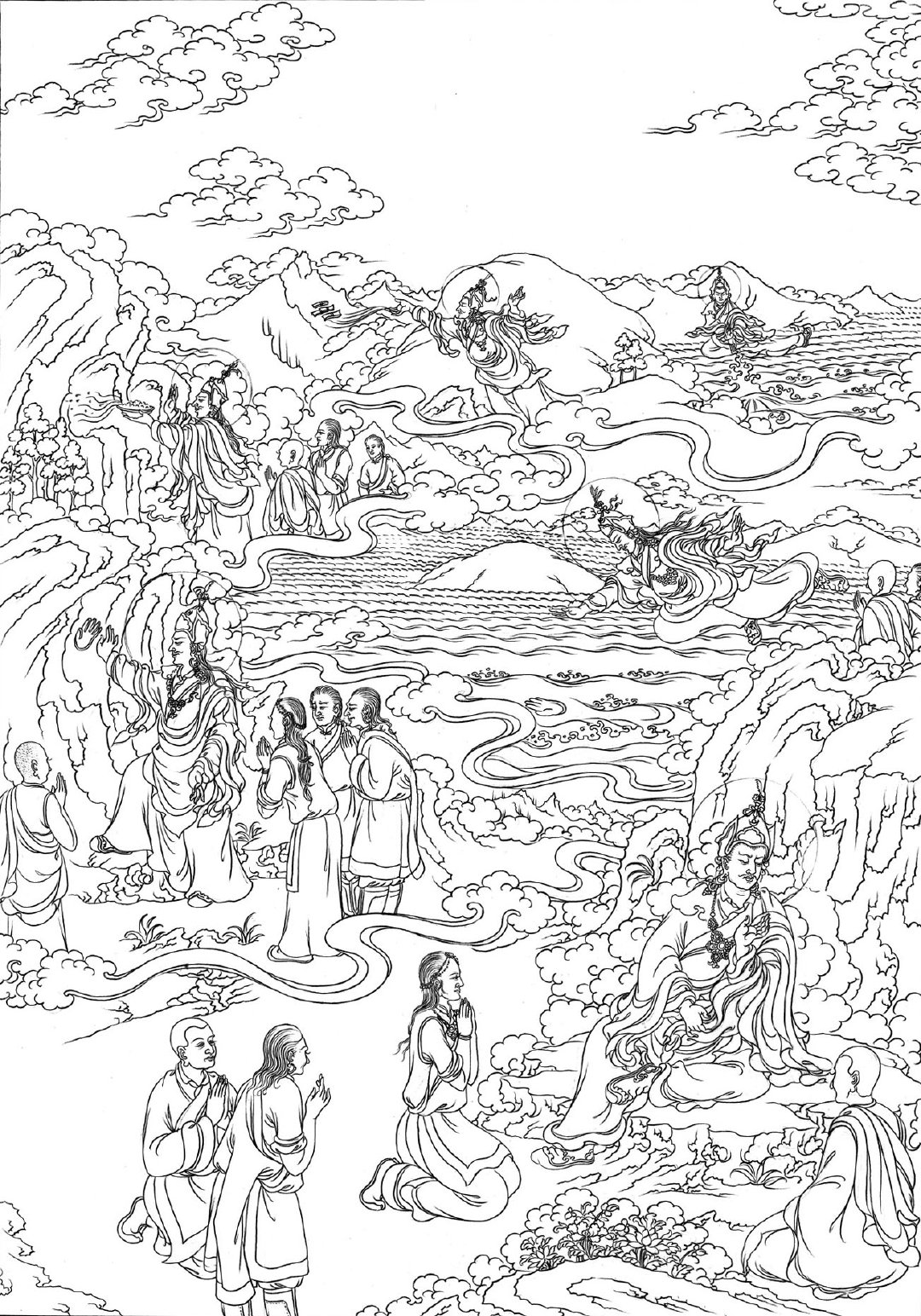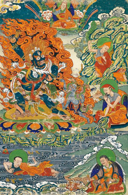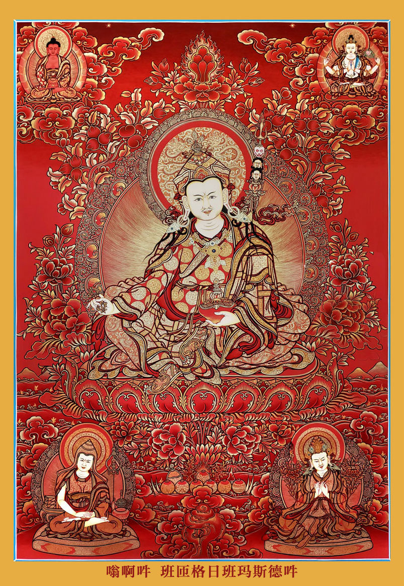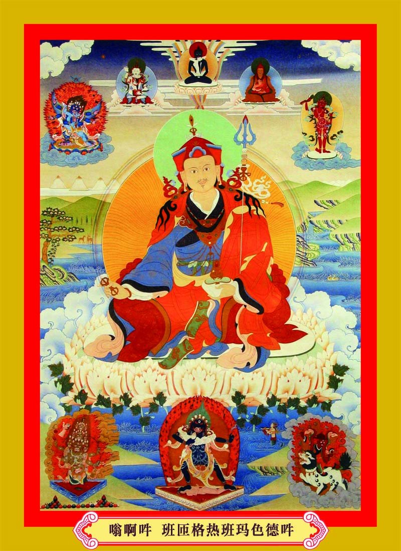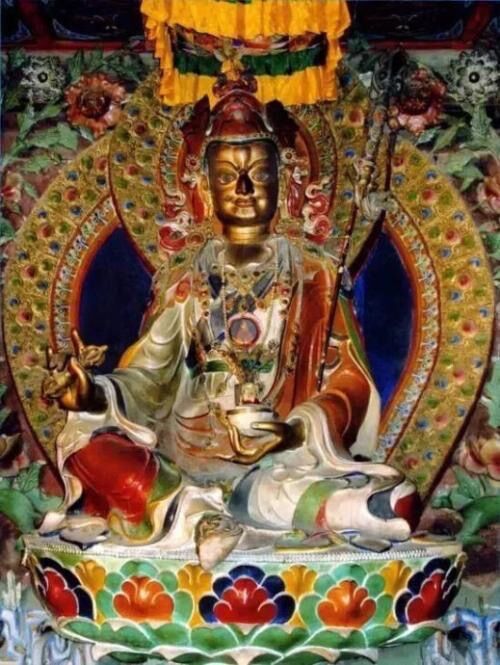 即是莲师受到迎请,在来藏地的途中,降伏了一切夜叉男女和骄慢的人与非人。如《莲师广传》中所说,把沿途那些粗暴的鬼神等都安立为藏地的守护神、伏藏法的护法。来到藏地以后,建立圆满圣教的根本,包括建立桑耶寺、组织译场大量翻译显密经续,以及转动续、教、窍诀的无边法轮,之后把人和非人的无量所化安置在成熟和解脱中等等,由此使得藏地境内一切处所都兴起了佛教的光明,并达到极为兴盛。