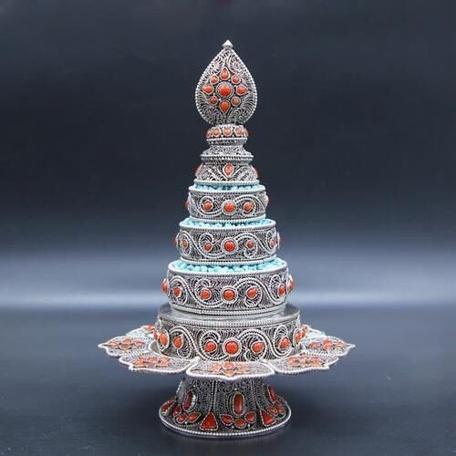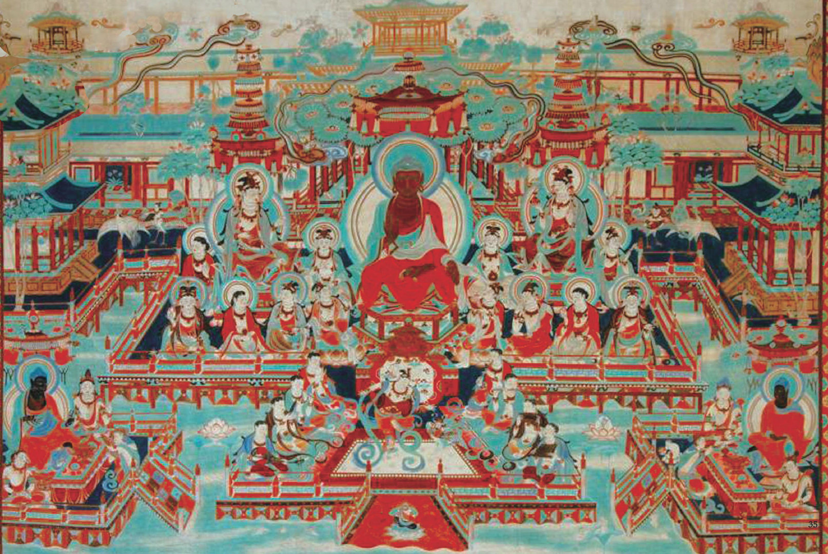 单以莲师化现在娑婆世界的情况来说,在整个三千大千世界六方的三十六个世间界里,以及六道等各处,都有莲师的化现。在我们所处的南瞻部洲,莲师示现为密教教主的身份,前后有八大莲师的事迹、二十种神变等等,且从幻化中再幻化,每一重幻化都不可思议。现今,莲师住在铜色吉祥山净土。铜色吉祥山上有莲花光刹土,分上中下三层,顶层是莲师的法身,即阿弥陀佛;中层是莲师的报身,即观世音菩萨;底层是莲师的化身,又有八种化身围绕。而且,在二十一个大罗刹洲里,莲师在每个处所都化现各种身份,行持各种事业。总之,莲师在法界周遍的处所,都任运兴起无量的事业相。