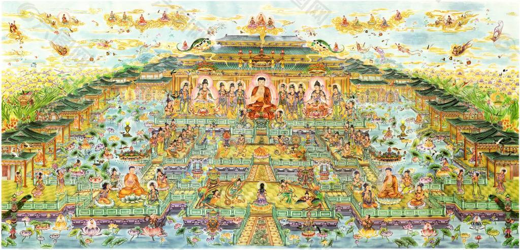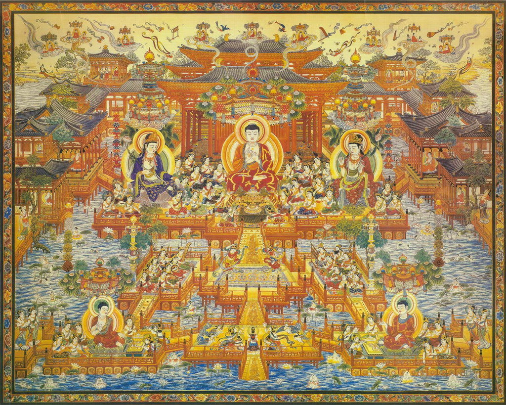《阿弥陀鼓音声王陀罗尼经》云:“西方安乐世界,今现有佛,号阿弥陀。若有四众能正受持彼佛名号,以此功德,临欲终时,阿弥陀即与大众往此人所,令其得见,见已寻生庆悦,倍增功德。以是因缘,所生之处,永离胞胎秽欲之形,纯处鲜妙宝莲华中,自然化生,具大神通,光明赫奕。”