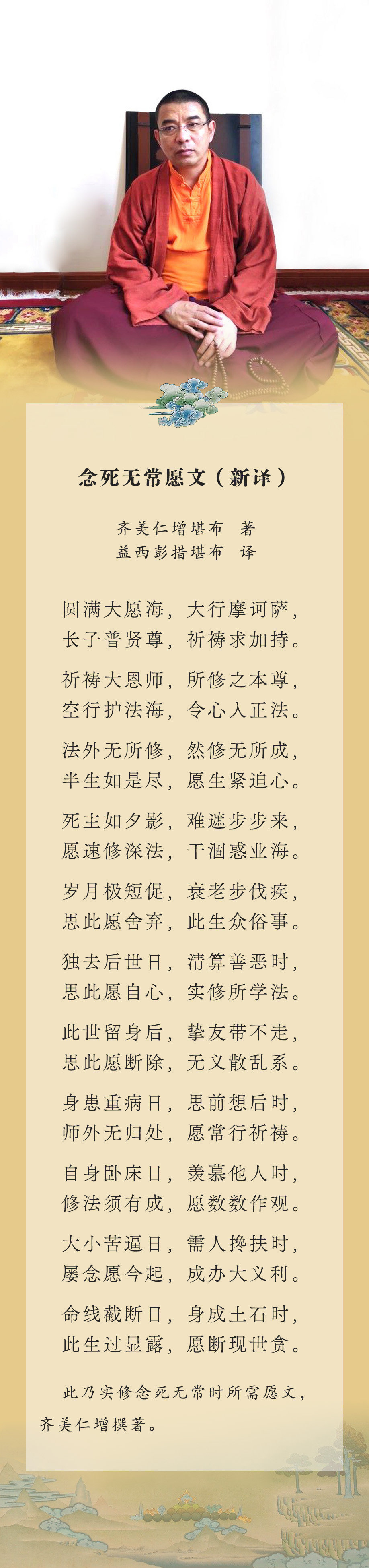 此《极乐愿文》……念修时,面朝西方,心念极乐世界,向阿弥陀佛合掌,以专一信心而念诵,如此则此世必定遣除寿障,来世必定往生极乐世界。
