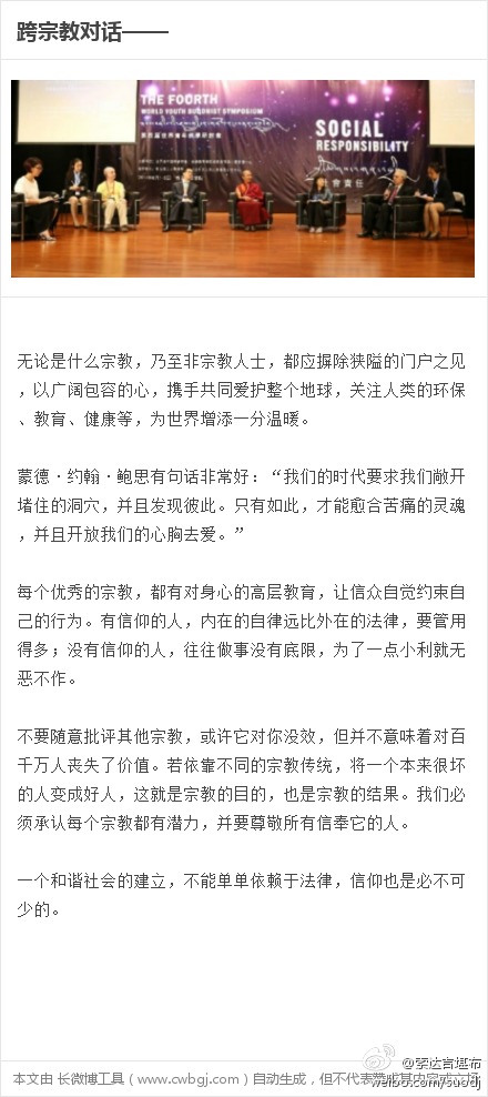不管你信仰基督教、佛教还是其他宗教,最好不要改变自己的信仰。宗教徒有一个开放的心态,非常重要。地球上的花朵五彩缤纷,才会让地球显得更美。当上帝遇到佛陀——与索达吉堪布相约新西兰