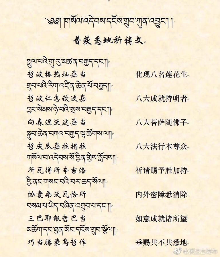 从今天起,寺院僧众将共修“普获悉地祈祷文”,每人一万一千遍。大家若想参与,可于1个月内圆满此数,并请给这条微博点赞报名,届时僧众会将功德一起回向。