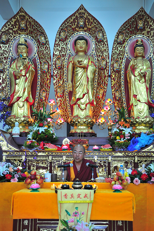 下午好!我在这个寺院中给各位作开示,因为时间关系,只简单讲三个方面的道理: