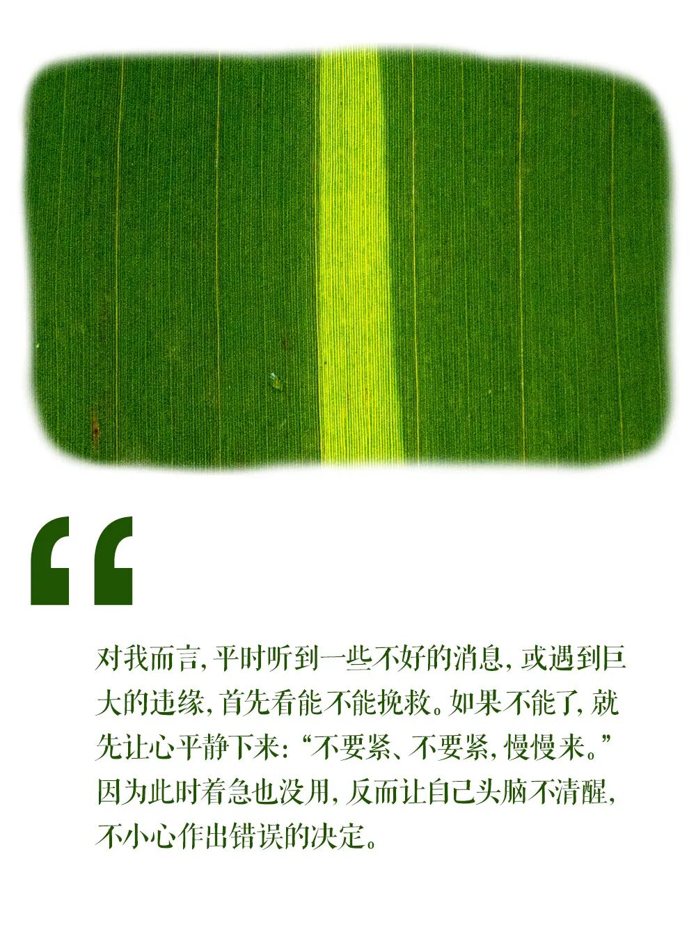做任何事情,提前要有一个安排,再一步一步去实行。不能急于求成,匆匆忙忙去做,否则就容易出问题。尤其是成办一些大事,要有充分的时间和精力,时间短了不行。比如我们修建一座大楼,若要求一年内必须完工,这绝对不可能。即使有人答应,质量也不会好。所以,做事应当循序渐进,不能太心急,不然的话,肯定会忙中出错。胖嫂生了个可爱的小宝宝,不久她收到母亲的来信,拆开一看,只见信中写道:“我生了重病,在床上躺了好几天……”信还没有看完,胖嫂就心急如焚,准备回家去看母亲。结果宝宝的小被子一时不见了,她翻箱倒柜找到后,抱起宝宝连夜赶路。路过一片西瓜地时,胖嫂被瓜蔓绊倒了,手中的宝宝也飞了。黑灯瞎火的,她忍着痛到处摸,摸到宝宝后,急匆匆地又上了路。终于来到母亲家,结果大门紧锁。胖嫂觉得可能出事了,一屁股坐在门口,大哭起来。这时,母亲正好从外面回来。胖嫂一看母亲很健康,非常惊讶,忙翻出那封信再看,原来信后面还有一句:“现在我的病已经好了,不要挂念。”母亲想瞧瞧自己的外孙,打开襁褓一看:外孙不见了,竟然是个大西瓜。她们又赶紧跑回家,发现小宝宝被扔在家里,因为睡得特别香,滚到床底下了。这虽然只是民间故事,却有很深的寓意。有些人性子非常急,这样的话,任何事都做不好,因为心态对做事很有影响。对我而言,平时听到一些不好的消息,或遇到巨大的违缘,首先看能不能挽救。如果不能了,就先让心平静下来:“不要紧、不要紧,慢慢来。”因为此时着急也没用,反而让自己头脑不清醒,不小心作出错误的决定。因此,我们要养成沉稳的习惯,不要遇到一点点小事,就手忙脚乱、不知所措。