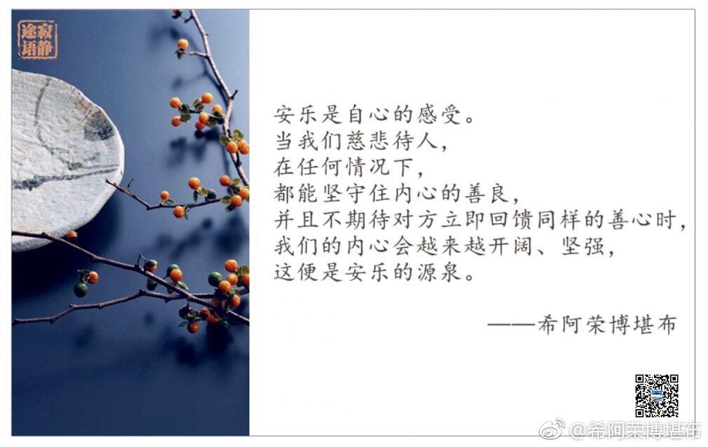 安乐是自心的感受。当我们慈悲待人,在任何情况下,都能坚守住内心的善良,并且不期待对方立即回馈同样的善心时, 我们的内心会越来越开阔、坚强,这便是安乐的源泉。