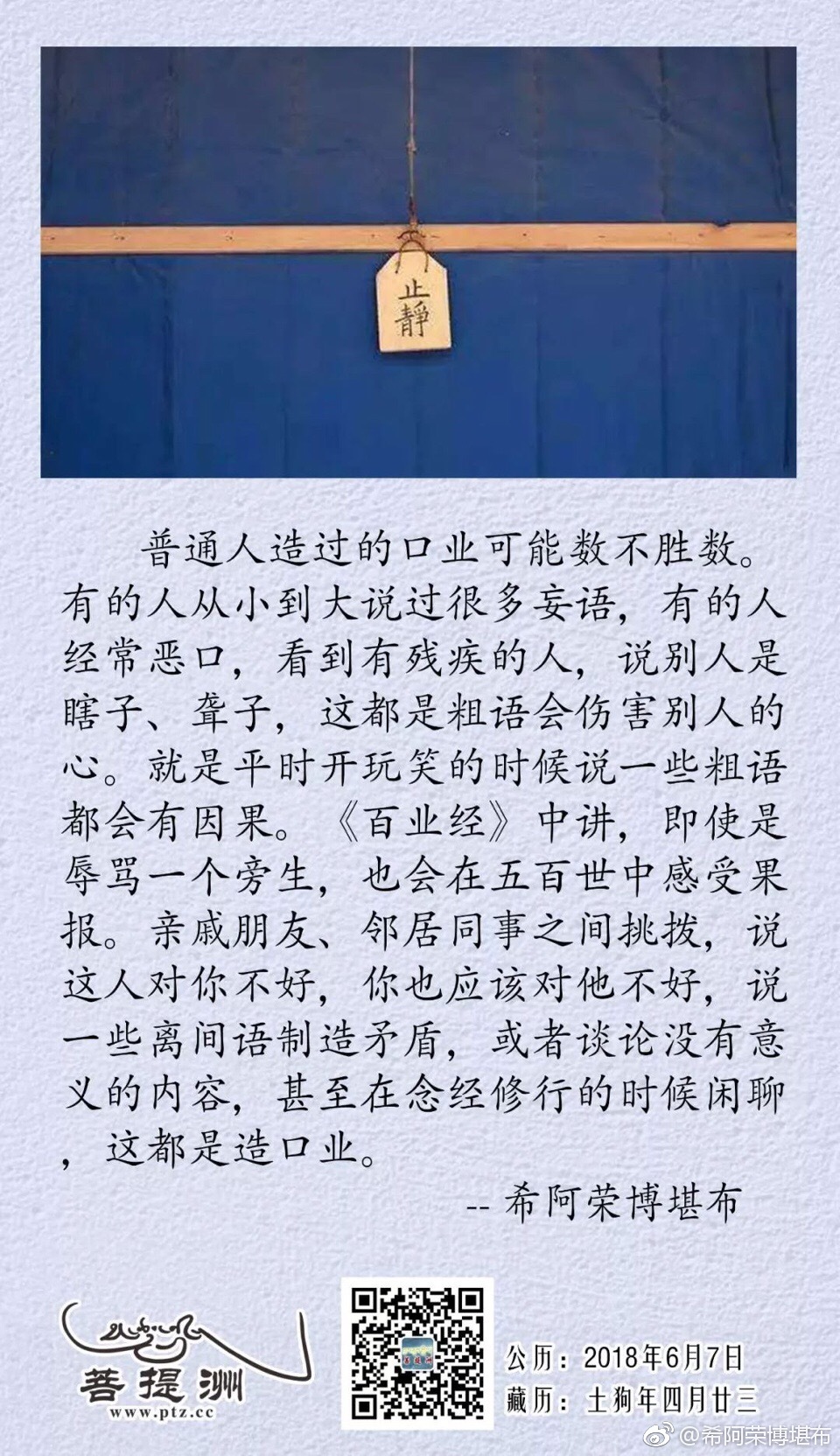 身体、语言行持善业的同时,就是在避免造恶业。当你念佛、念百字明的同时,你不可能再去骂人,是不是?所以大家平时不辍持咒、念佛,这其中的功德暂且不说,光是语的恶业,就不知要少造多少。