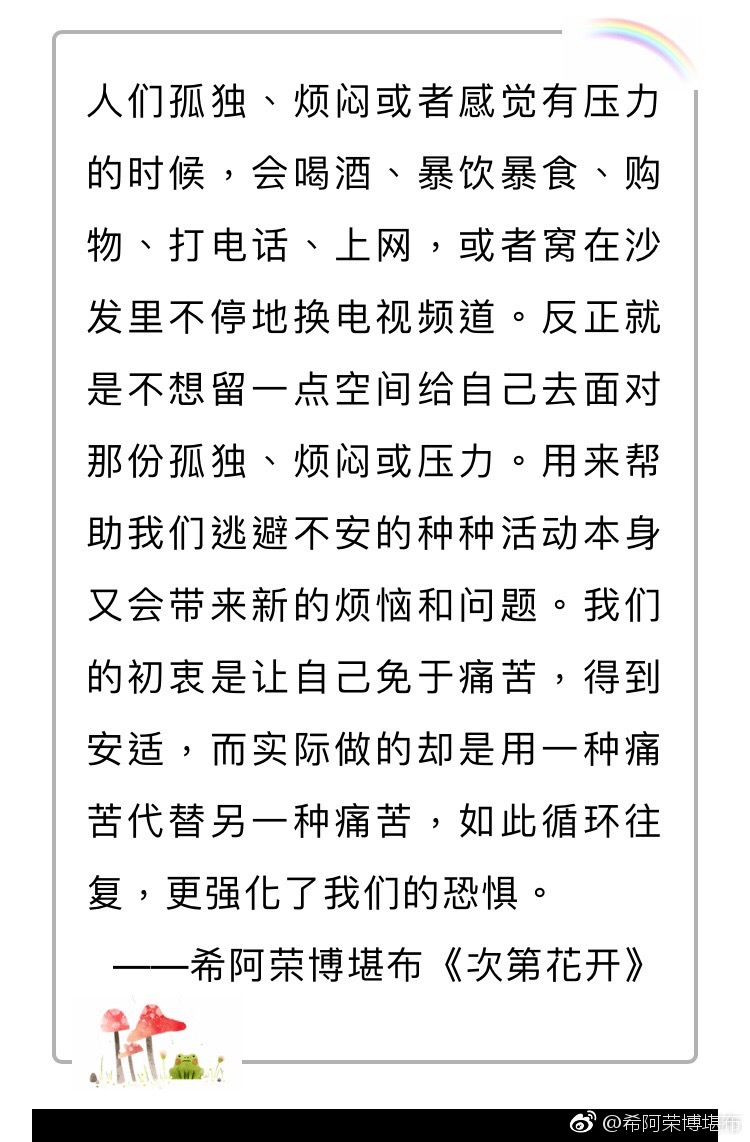 期望和恐惧其实是同一个东西的两面,有期望就会有恐惧,而回避则会加强恐惧。不迎不拒使我们放松下来,这时,我们才更有可能瞥见一切思想行为、一切欢喜哀愁背后的那个东西。