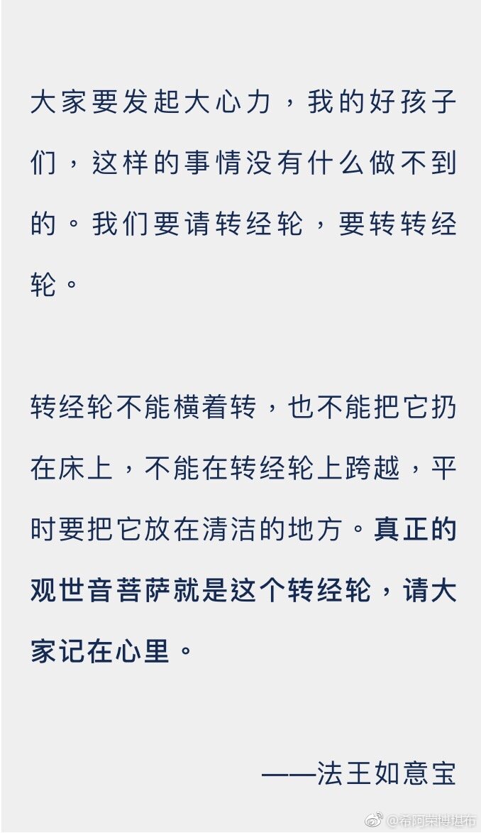 今天是藏历十五,阿弥陀佛节日。以清净信心忆念、祈祷阿弥陀佛,信愿坚定!《观经》中说:“然彼如来宿愿力故,有忆想者,必得成就。但想佛像,得无量福,况复观佛具足身相。” 南无阿弥陀佛!愿一切众生皆得无碍往生极乐世界,速证佛果。希阿荣博堪布以甚深缘起力,发起“扎西持林净土日课共修”