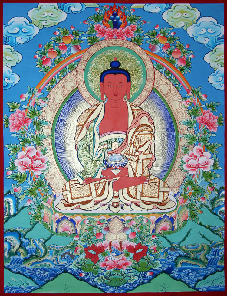 再者,持诵此咒,在整个自然界、人文世界上会发生怎样的增长呢?持咒相应后,大地的精气、滋味得到增长,众生的精气、精力得到增长。学法方面,精气、善心得到增长,智慧光明得到增长。菩萨道行上,六种波罗蜜多妙行都得到增长。如果想得五眼,那肉眼、天眼、慧眼、法眼、佛眼都能得到增长。又会增长灌顶,增长生天和涅槃。像这样普能增长一切善法。又能增长一切大地种子的根茎枝叶花果,增长药谷的精气滋味,增长雨水,增长有利益的地水火风,增长内心的喜乐,增长财宝,增长殊胜的力量,增长一切受用资具。而且,这个陀罗尼能让一切智慧达到猛利,破除烦恼贼。它真是大如意宝,想要增长功德的话,就要多持长咒。