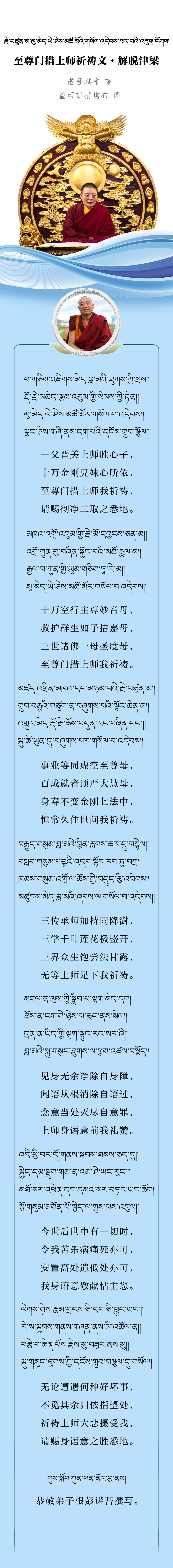 法王如意宝的补处之一怙主龙多活佛所造的《相联往生四因之发愿文》,是作者二十五年中自行化他实修净土法后,从大圆满智慧中流露出的具大加持力极乐愿文。平时如法念修此文,必得上品往生极乐世界!