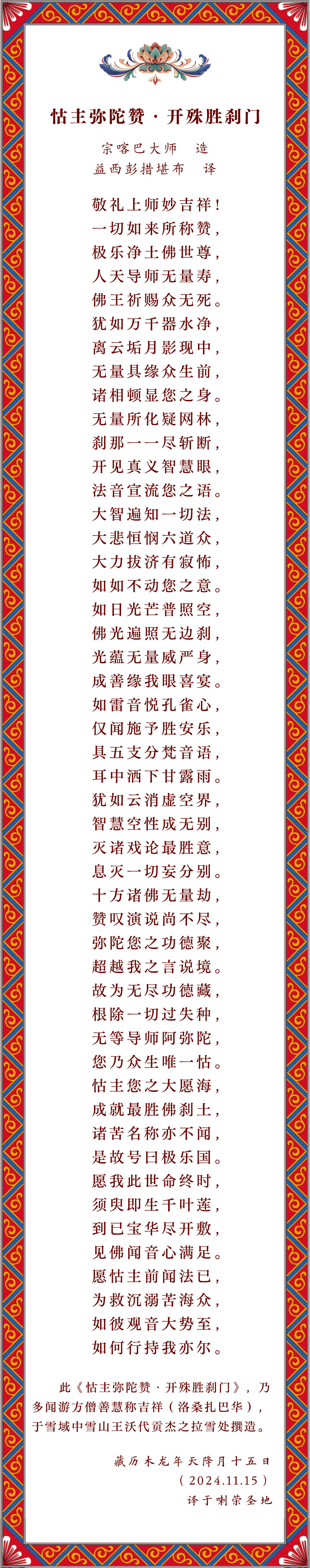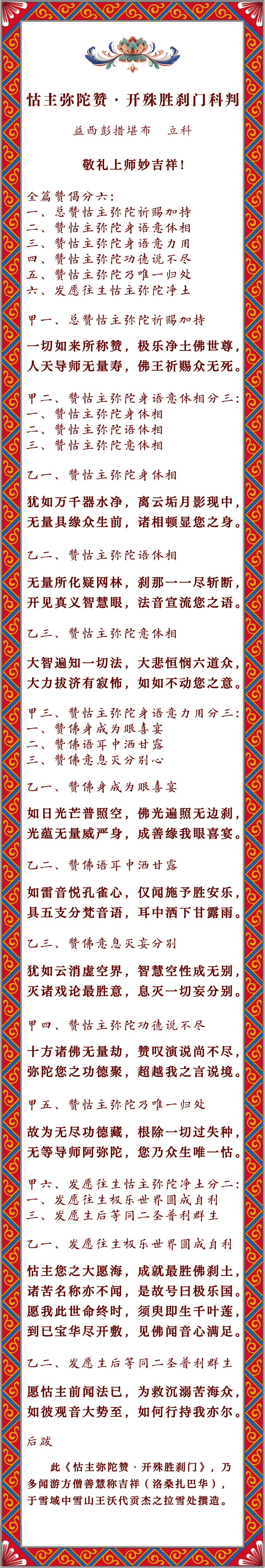 大智文殊菩萨的真实化身、三界导师、雪域智者顶严宗喀巴大师所造的《怙主弥陀赞》,文义超胜独妙,极具加持神力,最近翻译出来了并立了科判,佛友们平时可以念修这个来赞颂怙主阿弥陀佛。