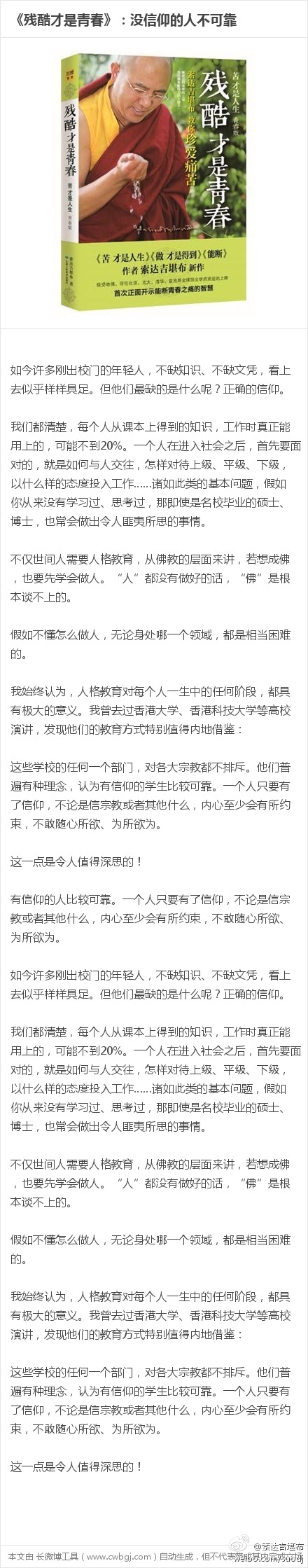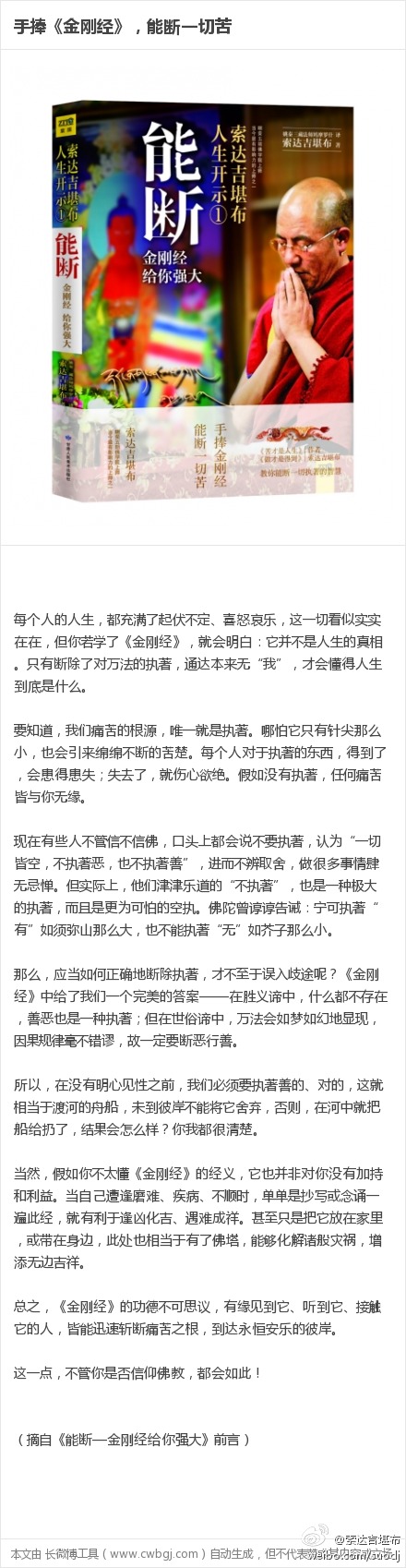 【索達吉堪布:比珠穆朗瑪峰更高的是藏地精神寶庫】适逢漢地釋迦牟尼聖誕日,在喇榮五明佛學院要開始一年一度的金剛薩埵法會。佛學院大堪布索達吉說:「藏地這個地方是一個精神寶地。很多人都喜歡珠穆朗瑪峰,但比珠穆朗瑪峰更高的一種精神寶庫,應該說是藏地的密傳佛教。」网页链接