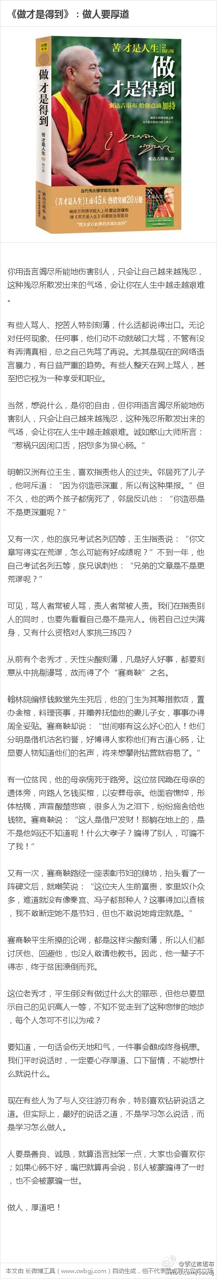 【《做才是得到》:做人要厚道】一句话会伤天地和气,一件事会酿成终身祸患。我们平时说话时,一定要心存厚道、口下留情,不能想什么就说什么。(分享自凤凰网连载网页链接)