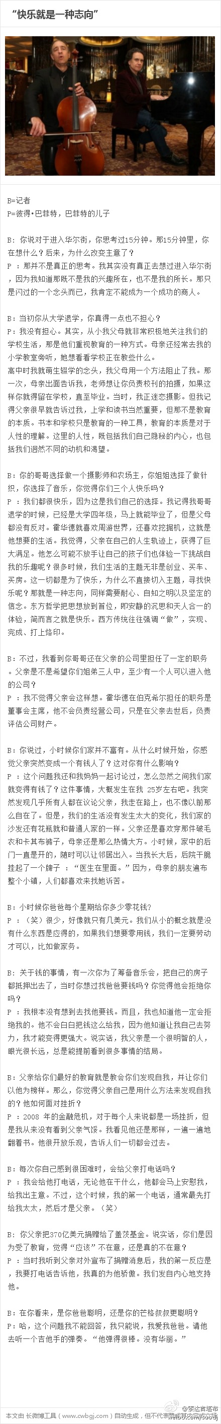 父母为子女规划人生时,应在反复考量的基础上,尽量尊重“他们喜欢什么”,不是“你觉得他们需要什么”。巴菲特的儿子,就没有继承“股神”衣钵,而成了一名音乐家。他说:“父母希望我和我的兄弟都能找到热爱的事业。假使我宣布我生活的乐趣是捡垃圾,父母看到我整天待在垃圾车上,也会高兴。”