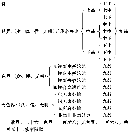 三界见修所断共分九十八种,欲界见修五类所断共分三十六种,色界分三十一种,无色界分三十一种。