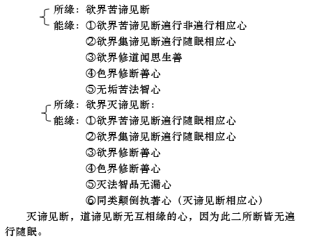 注:欲界、上二界之断苦集见断各安立一个遍知,是因为若只是苦谛下遍行因断,则三个条件中第三个条件不具足,所以须集谛下之遍行因亦断后,第三个条件才具足,即才能安立一个遍知。而灭、道谛见断,于灭、道法(类)智起时,前苦集谛下遍行因已断,而自类之同类因亦断,所以,第三个条件具足,故各自可以安立一个遍知,而与苦集不同。
