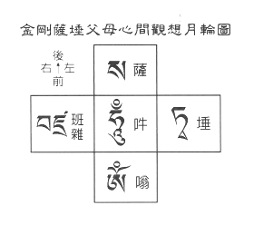 就在这尊金刚萨埵(即自己)的心间,观想一个如扁芥子大小的月轮,在这个月轮上的中央,是蓝色的藏文吽(ཧཱུྃ)字,吽的前面是白色的藏文嗡(ཨོཾ)字,右边是黄色的藏文班扎尔(བཛྲ),后方是红色的藏文萨()字,左边是绿色的藏文埵(ཏྭ)字,吽字周围有五个字,合起来就是“嗡班扎尔萨埵吽”( ཨོཾ་བཛྲ་ས་ཏྭ་ཧཱུྃ)。