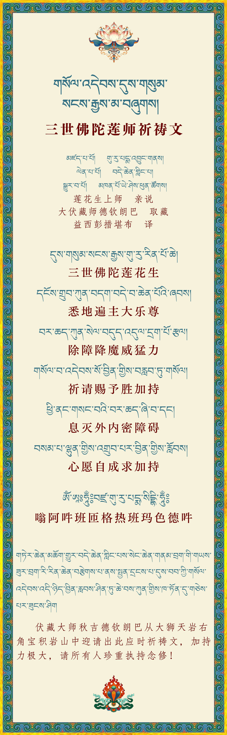 大伏藏师德钦朗巴所取的《三世佛陀莲师祈祷文》,是所有祈祷文的心要,加持力极大,第二世敦珠法王从外内密三层阐释了本伏藏修法的要义。望佛友们精读这一注释,理解法义后常常念修,定能尽除诸障,成满所愿!