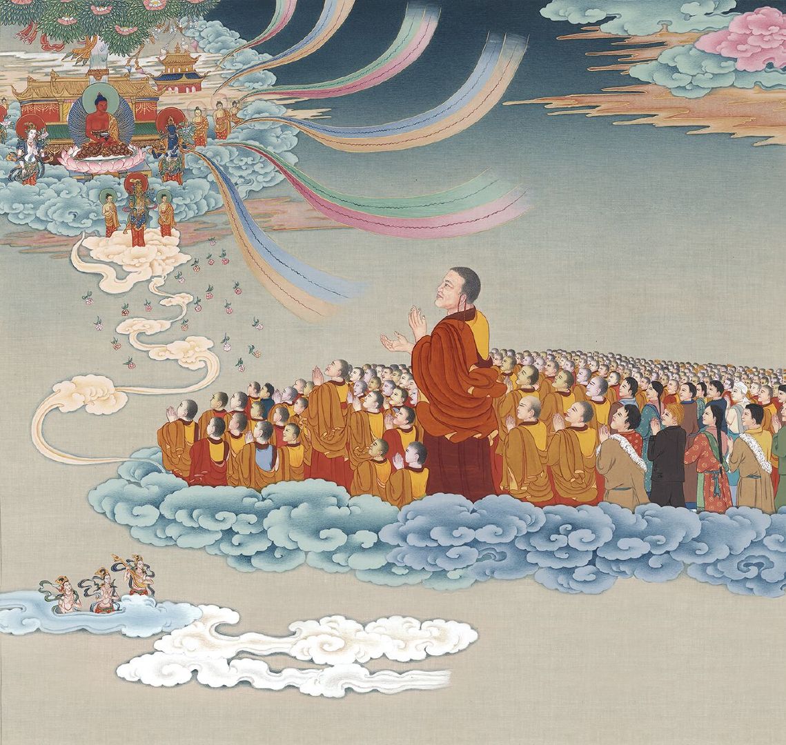 要这样想:具足一切善妙功德,极其殊胜的极乐世界,是由法藏菩萨的大智慧、大慈悲、大愿力、无量菩萨行海摄集而成。净土的一毛一尘,圆明具德,美妙无比,无一不是从佛的大愿海中流现,极其不可思议。从往生到西方净土后,人人的眼耳鼻舌身都能触到阿弥陀佛无漏智慧所变现的妙相,完全处在加持的海洋当中。