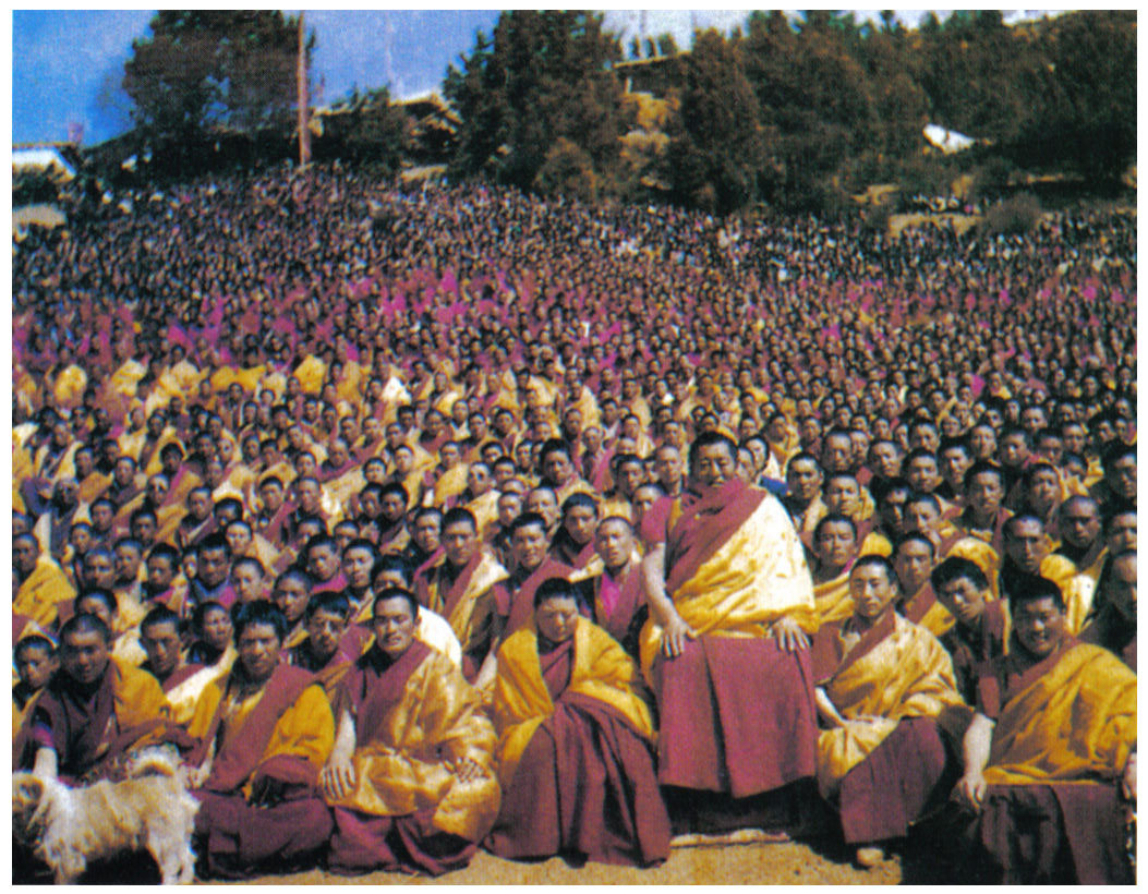 即是当年那烂陀寺的经堂里,五百多个外道师跟内道辩论,内道无法取胜,处境非常危险。大多数智者在梦中梦到空行母“殊胜寂静”来作授记:“你们是没法辩倒外道的,我的兄弟颅鬘力正在清凉尸陀林,如果不迎请他,圣教就会毁灭。你们要好好地供养,以大恭敬心同时念金刚七句。”于是,他们听从教导,如是而行。就在称念的当下,格热仁波切从空中降临,随后坐在五百位智者的上首,以教理胜伏了外道。