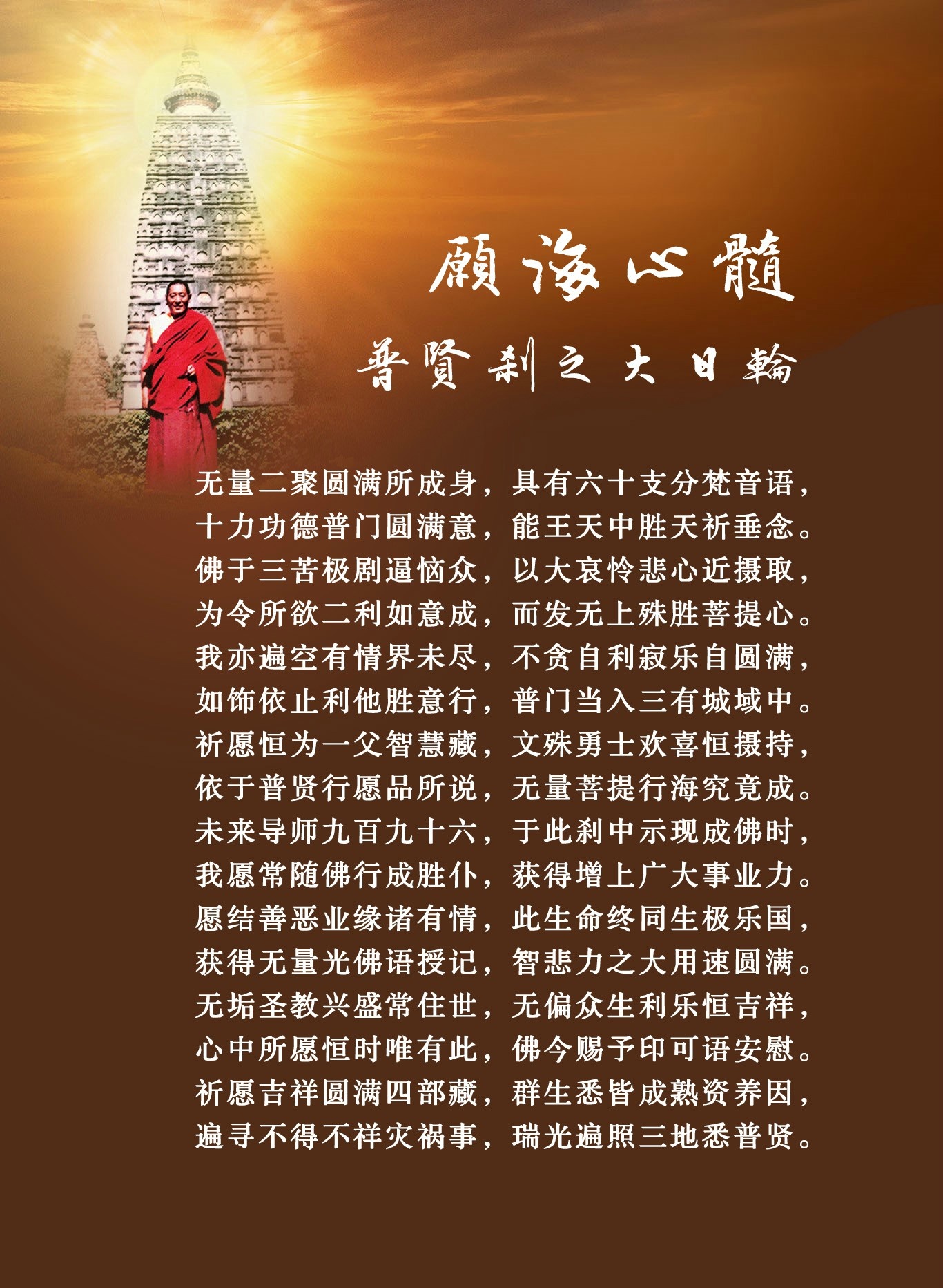 我们在修本法——《愿海心髓·普贤刹之大日轮》时,首先要认识到这是“愿海心髓”。也就是无量的菩萨行海愿、殊胜的普贤大愿王,摄集到心髓点上就是法王写的这篇大文——《普贤刹之大日轮》。要知道,这篇心髓法涉及到最关键要点,从这里能速疾趣入普贤行愿海。特别对于当代众生来说,这是极具窍诀性、极其精要、点中心髓的法。