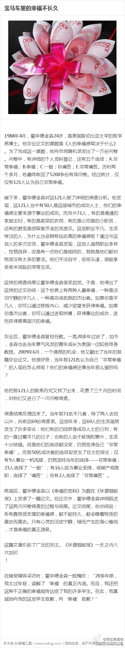 接受媒体采访时,霍华德金森一脸愧疚:“20多年前,我太过年轻,误解了‘幸福’的真正内涵。而且,我还把这种不正确的幸福观传达给了我的许多学生。在此,我真诚地向我的这些学生致歉,向‘幸福’致歉!”