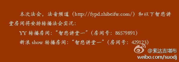 1月13日至19日,学院将举办为期7天的法王圆寂十周年纪念法会。凡参与法会者,最好能念诵金刚萨埵心咒“嗡班杂萨多吽”十万遍,看一遍法王的珍贵教言《不离》。直播:网页链接