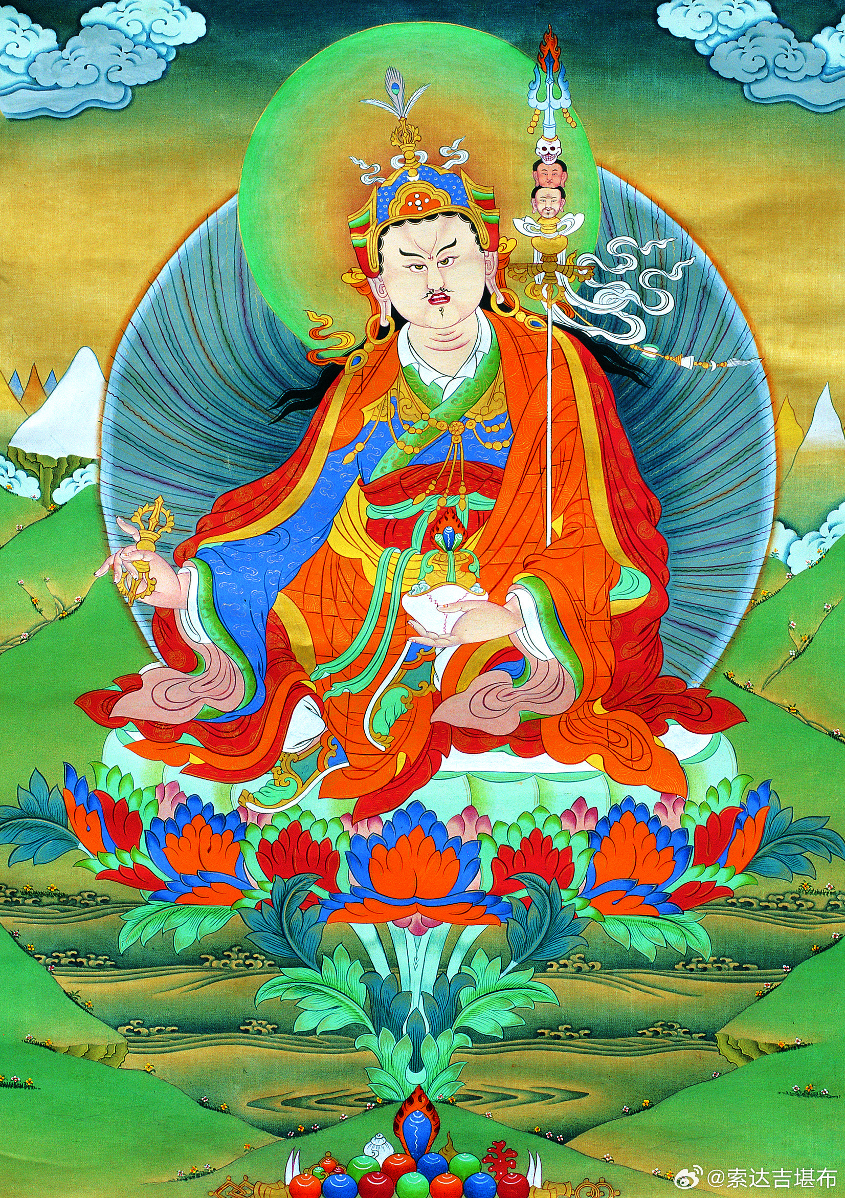 尔后,莲花生大士告言:“噢,具有信心的女子,您所陈述千真万确,于未来如是时刻对众生必定有暂时究竟利益的不可估量窍诀修行,许多已隐蔽成地伏藏、水伏藏、岩伏藏、虚空伏藏等。恶时之际,有缘者的方便缘起极难聚合,这是众生福德穷尽之相。然而在如此之时,这一‘嗡啊吽班则革日班玛斯德吽’,在圣地或寺院或高山之巅或大河之畔,鬼神魑魅猖獗的沟头沟尾等处,具足誓言的咒师、具足戒律的僧众、具足信心的士夫、具足法相的女子等,如果在广大发心的状态中尽可能念诵百、千、万、十万、千万、一亿遍等,则功德利益威力不可思议。于一切地方,能遣除疾疫、饥馑、刀兵、战乱、天灾、凶兆、厄运,能令风调雨顺,农牧丰裕,诸地吉祥。在今生、来世、中阴,上根者直接、中根者于觉受中、下根者于梦中屡屡见到我,次第圆满地、道以后,必定于妙拂洲刹土趋入男女持明行列。