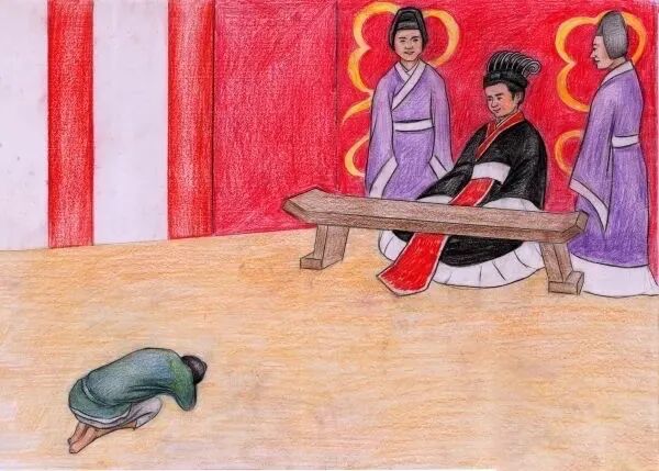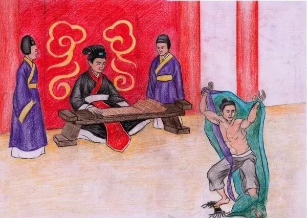 自知有错的山羌族人,明白再也不能狡辩了,惭愧地低下了头,他赶紧脱下衣服,跪倒在地:“国王陛下,我知错了,以后再也不敢了。请您从轻处罚我吧!”