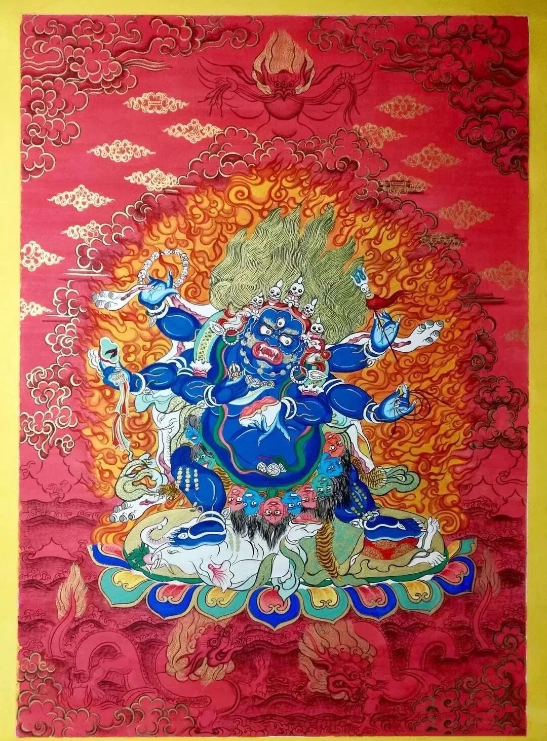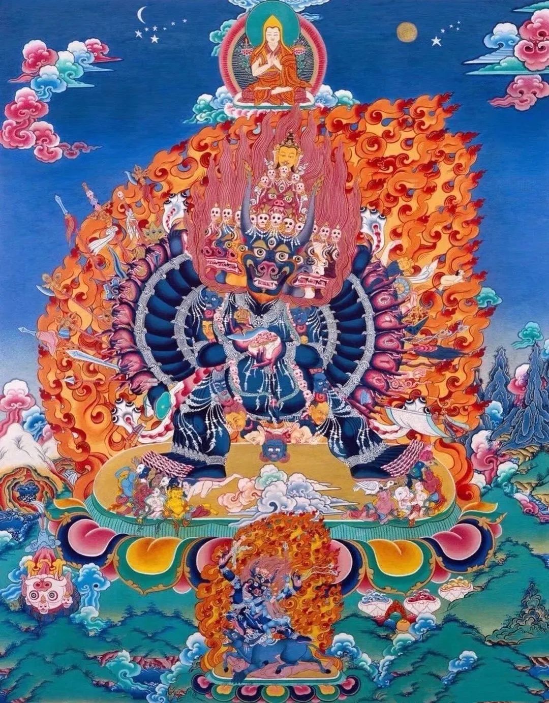 忿怒金刚的头发,都是立起来的,象征所有轮回的不清净现象都与涅槃或者佛的坛城不可分离,在法界当中都是清净的;一般的佛菩萨背后,有一圈光芒,但忿怒金刚的背后却不是光芒,而是火焰,象征证悟空性的智慧——以证悟空性的智慧摧毁三界轮回,烧掉六道众生的烦恼和痛苦。