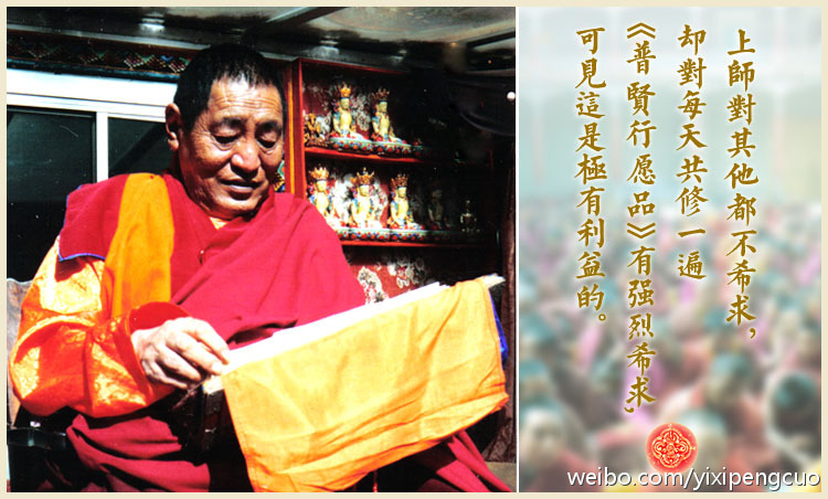 法王上师晚年常常说:“我现在对什么都不希求,但对僧众每天能念诵一遍《普贤行愿品》却有强烈的希求心,如果僧众每天能如法念一遍《普贤行愿品》,我住在世间也觉得有意义。”这就可以看出上师对《普贤行愿品》的重视程度,其他都不希求,却对每天共修一遍《普贤行愿品》有强烈希求,可见这是极有利益的。