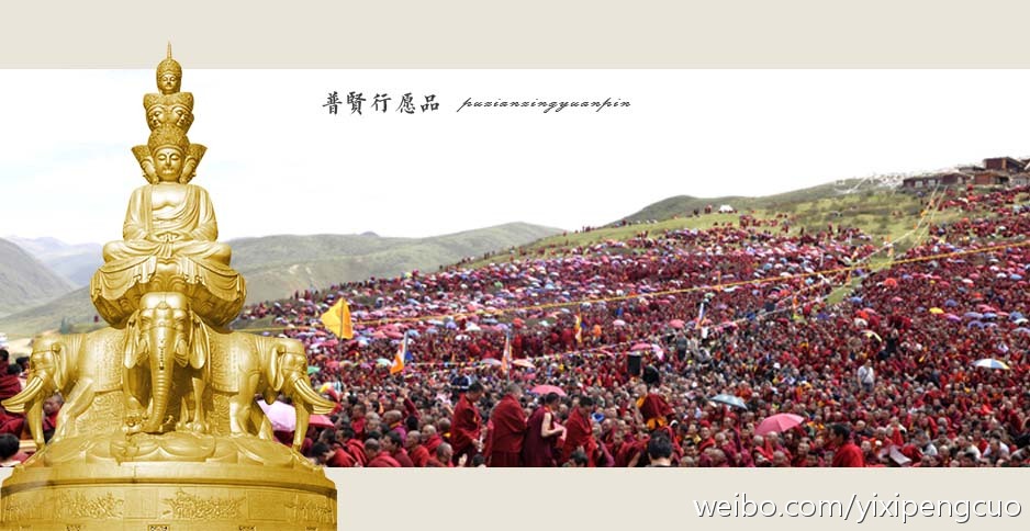 四、不仅如此,每年在喇荣举行各大法会及平时念经、超度,也都念诵《普贤行愿品》。各大法会四座修法前后,个人闭关四座修法前后,甚至开金刚娱乐法会,都念诵《行愿品》。而且,四众弟子朝山、拜见大德、在殊胜的三宝所依前、放生前后,甚至到草原上见到鲜花对上师三宝作供养时,也一定要念上一遍《行愿品》。