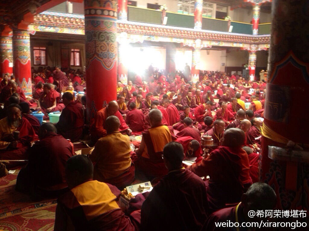 扎西持林今天开始召开五天的莲师法会。在得知云南发生地震的消息后,参加法会的四众弟子共同为地震中的伤亡者念经祈福。也希望大家能够尽自己的能力念诵莲花生大士心咒,为正在感受苦难的众生回向功德。祈愿亡者安宁,伤者早日康复。一切众生脱离痛苦。嗡啊吽 班匝格热班玛色徳吽!