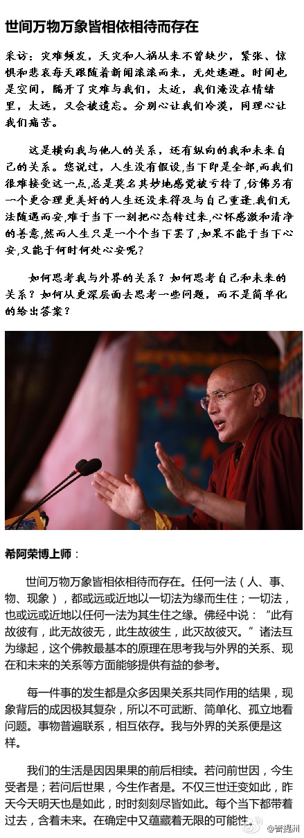 佛法给我们宽广的视角。视野宽了就知道眼前这一事一物没有哪个是孤立存在的,在时间和空间上,各各不同的事物现象之间其实都千丝万缕的联系着。当你想把所有矛盾和问题都归咎到某个人某件事上时,你会发现这样做很难。当你看见别人这样做,你也能理解那种极端和狭隘是多么复杂的诸多因素共同造成的。