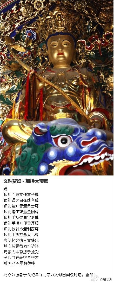 这个念诵非常殊胜,当年在喇荣五明佛学院,大恩上师法王如意宝在传讲经论前都会念诵这个颂词,祈祷大智文殊菩萨。希望大家也能长期念诵,这对开启智慧有极为殊胜的加持。