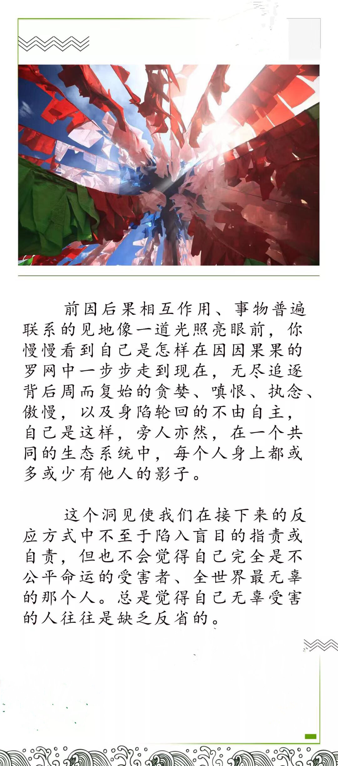 人一生的经历,概括起来就是:缘会即现,缘灭即散。因缘到了,不想经历也得经历,因缘尽了,想留也留不住。悲欢喜乐实在都是各人的因缘,而且很多时候是没得选择的。佛教并不反对经历,但更鼓励大家去探索经历背后的东西,并有意识地借助种种经历去培养慈悲和智慧。